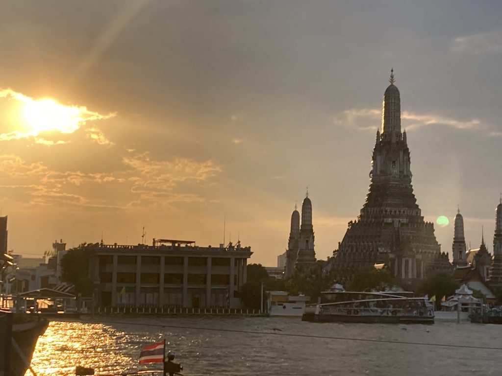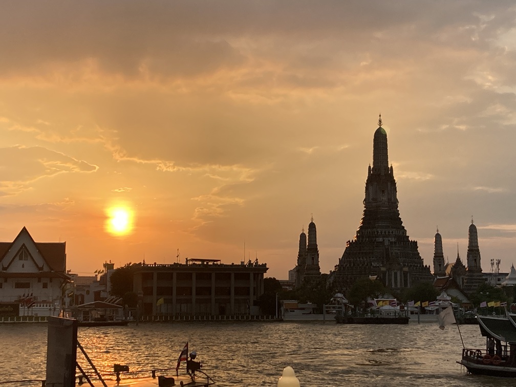 対岸のレストランで 夕焼けの“ワット・アルン”を見ながら食事をすること!